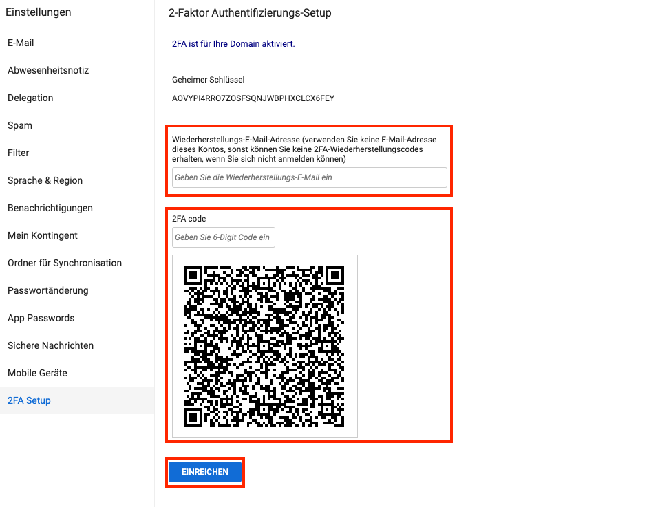 Scannen Sie nun mit Ihrer Authentifikations-App den QR-Code ein und geben diesen in das Feld ein. Die Installation wird mittels dem Button “Einreichen” abgeschlossen.
