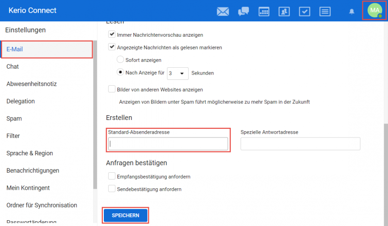 4. Im rechten Fenster unter 'Erstellen' können Sie nun die Absender-Adresse definieren.