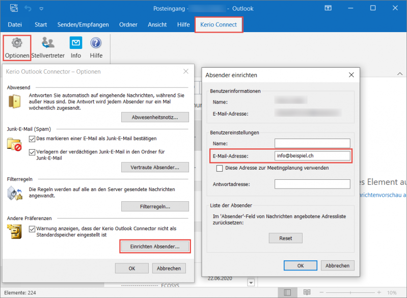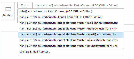 | Wenn der Absender im Webmail korrekt definiert ist, wird dieser im Outlook automatisch übernommen. Änderungen im Outlook werden ebenfalls entsprechend ins Webmail übernommen. |