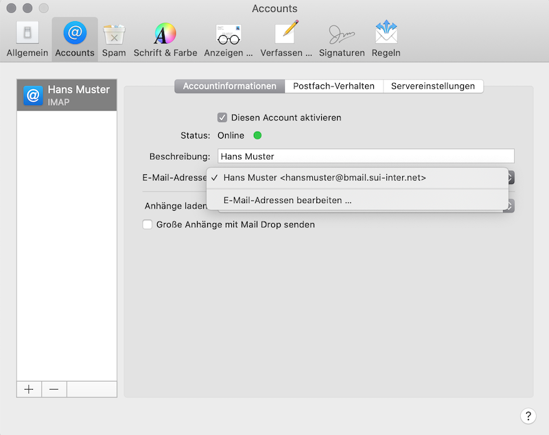 | Die Absender-Adresse kann im Mac Mail nur angepasst werden, wenn der Account mittels IMAP eingerichtet ist. Bei Verwendung von Exchange ist eine Anpassung leider nicht möglich. |