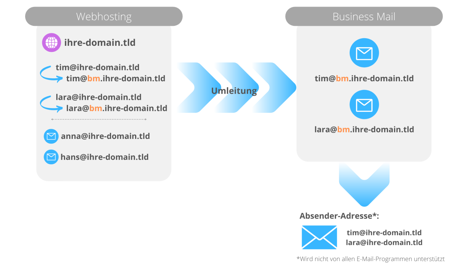 Diese Umleitung lautet auf die Subdomain, zum Beispiel tim@ihre-domain.tld → tim@bm.ihre-domain.tld