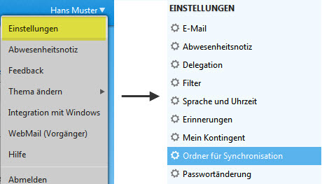 1. Hierzu wählen Sie im Webmail unter Einstellungen das Menü Ordner für Synchronisation