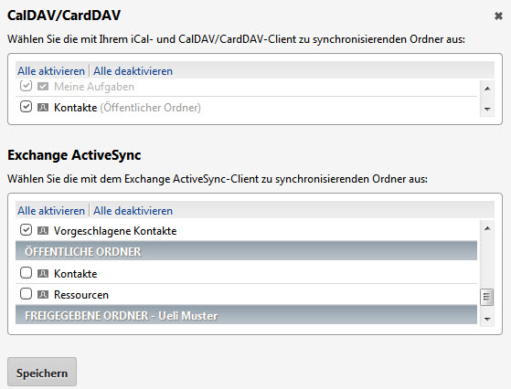 Welche Ordner mit dem mobilen Gerät mittels Exchange und/oder einem CalDAV/CardDAV Programm synchronisiert werden sollen, kann im Webmail eingestellt werden.