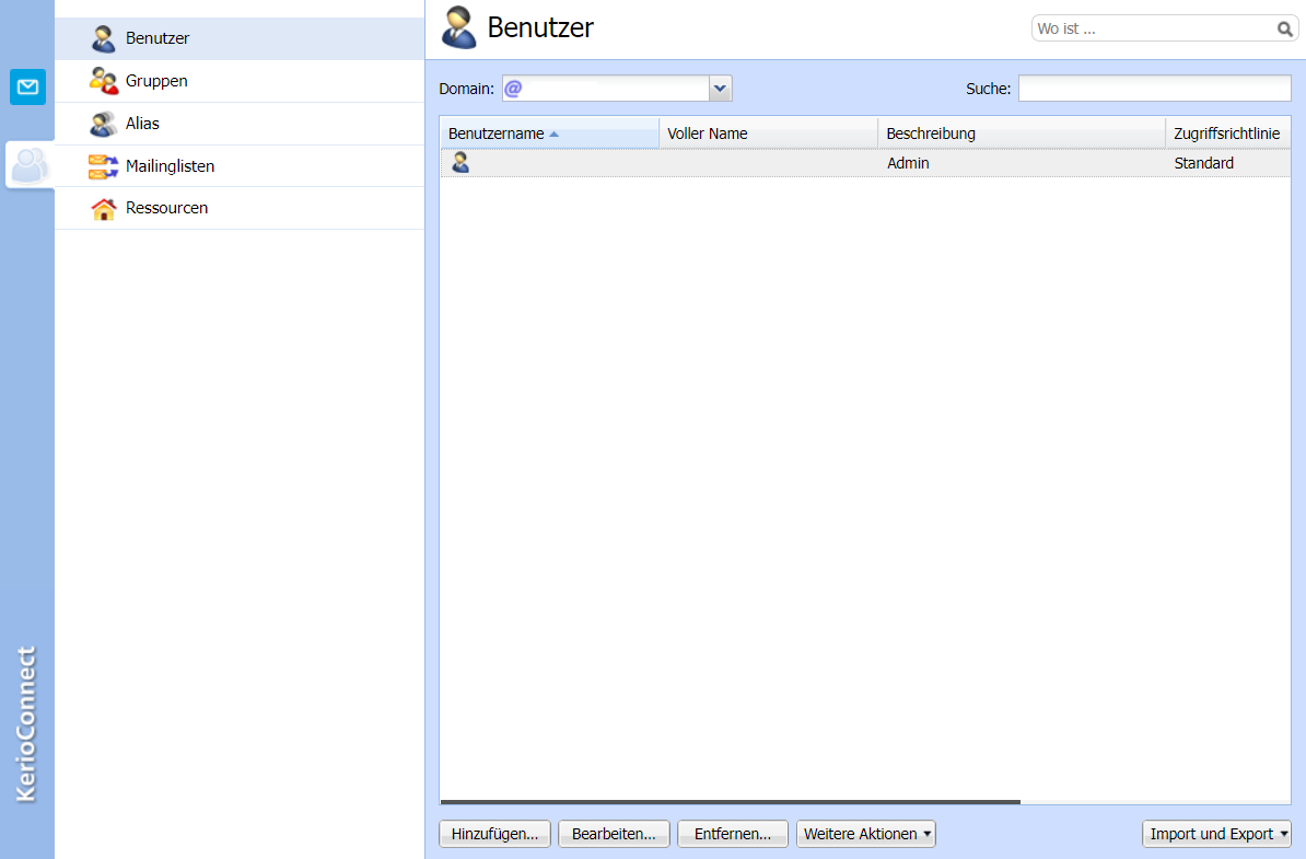 Über das Menü auf der linken Seite haben Sie Zugriff auf die Verwaltung der verschiedenen Elemente wie Benutzer, Gruppen, Aliase, Mailinglisten oder Ressourcen.