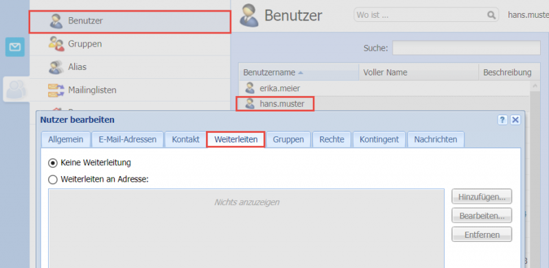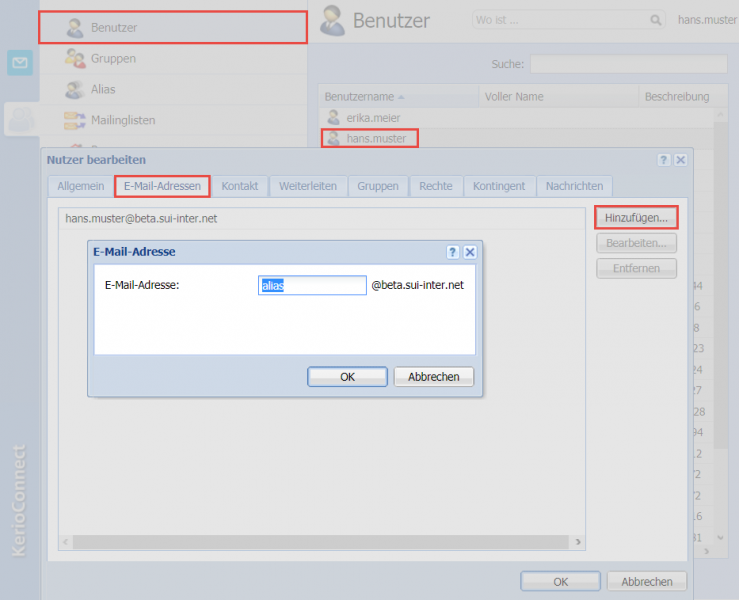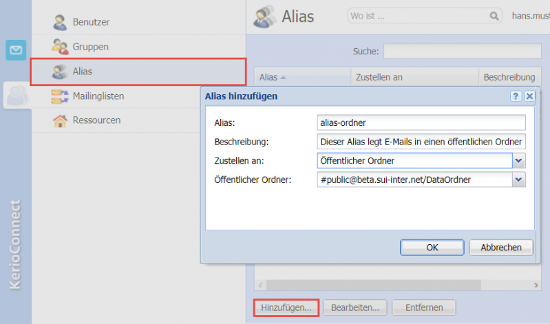 | In diesem Menü können auch Alias Adressen für bestehende E-Mail-Adressen erfasst werden. Dies haben jedoch den Nachteil, nicht als Absender verwendet werden zu können. Erstellen Sie deshalb für E-Mail-Adressen einen Alias wie hier beschrieben. |