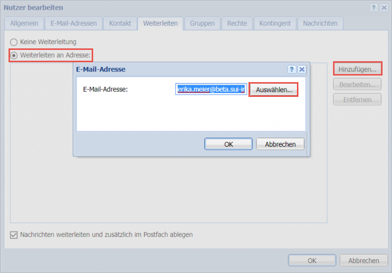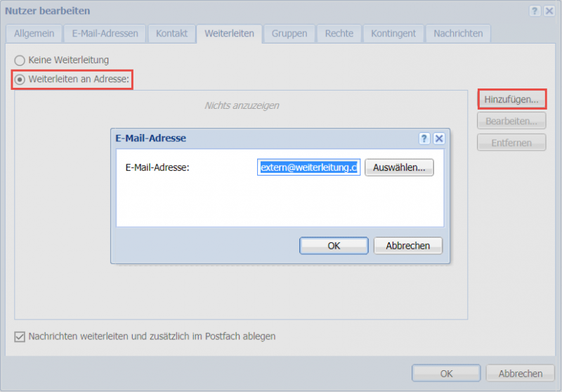 | Standardmässig wird die Nachricht umgeleitet. Falls Sie eine Weiterleitung wünschen und die Nachrichten somit auch in diesem Postfach haben möchten, wählen Sie ganz unten die Option "Nachrichten weiterleiten und zusätzlich im Postfach ablegen". |