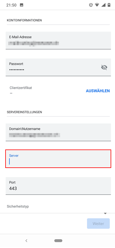 | Beachten Sie die spezielle Notation im Feld „Domain\Nutzername“ Hier muss die E-Mail-Adresse anstatt „ihre@businessmailadresse.ch“ als „businessmailadresse.ch\ihre“ eingetragen werden. |
