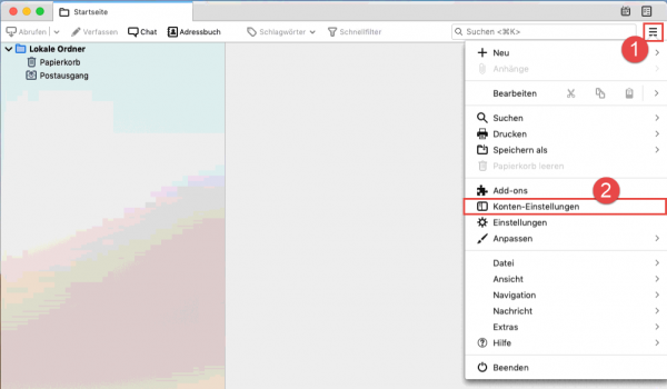 Öffnen Sie Thunderbird und navigieren Sie über -> Einstellungen -> Konto-Einstellungen.