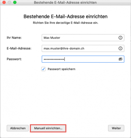 Tragen Sie nun Ihren Namen, die E-Mail Adresse sowie das dazugehörige Kennwort ein. Klicken Sie danach auf Weiter und anschliessend auf Manuell bearbeiten.