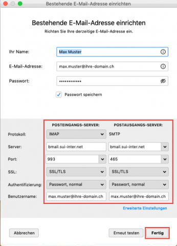 | Postausgangs-Server | bmail-sui-inter.net | 465 | SSL/TLS | Passwort, normal | Ihre E-Mail-Adresse |