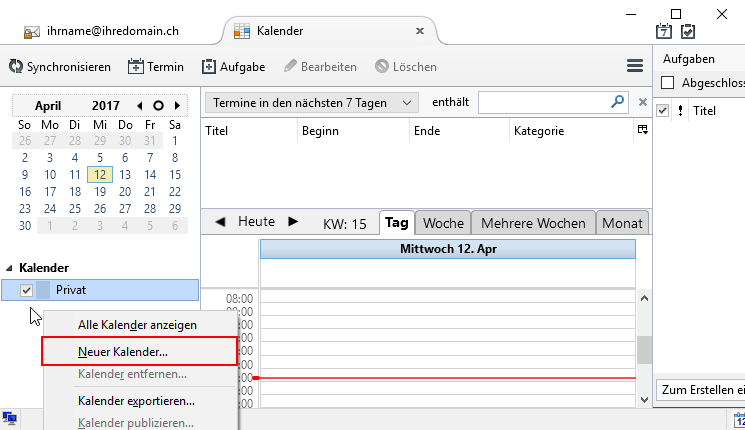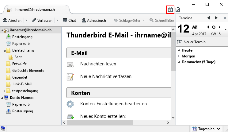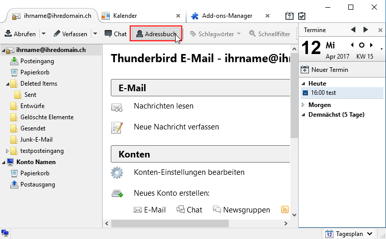 Für Thunderbird existiert keine automatisierte Installations-Routine welche das Konto einrichtet. Daher müssen die E-Mails, Kontakte und Kalender manuell hinzugefügt werden.