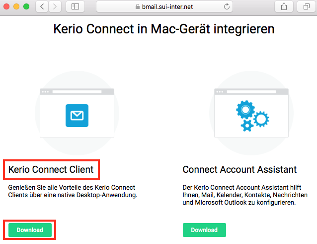 2. Es stehen nun mehrere Option zur Verfügung. Klicken Sie beim "Kerio Connect Client" auf "Download" um die Software herunterzuladen.