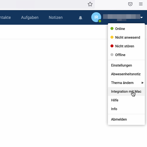 Loggen Sie sich im Webmail Ihres Business Mail Kontos ein unter https://bmailX.sui-inter.net - den korrekten Server entnehmen Sie der Einrichtungsbestätigung. Klicken Sie oben rechts auf Ihren Namen und anschliessend auf Integration mit Mac.