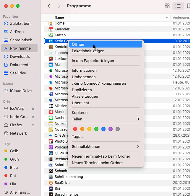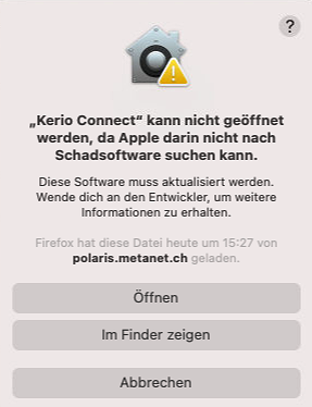 Wenn der Kerio Connect Client in Programme bei Mac verschoben wurde, wählen Sie ihn mit “Rechtsklick” (Control-/Ctrl-Taste + Klick) an und klicken Sie auf Öffnen. Bestätigen Sie danach erneut, dass Sie Öffnen möchten. Dieses Vorgehen ist nur beim ersten Mal notwendig, danach kann das Programm wie gewohnt jeweils mit Doppelklick geöffnet werden.