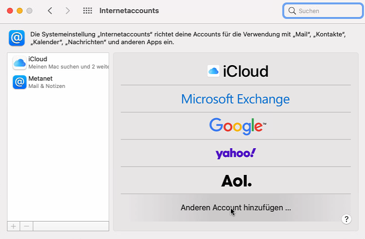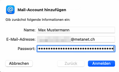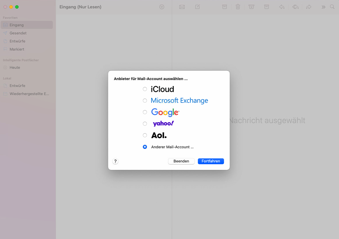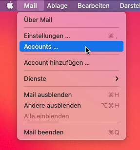 Bitte wählen Sie in Mac Mail Anderer Mail-Account. Wenn Sie schon Konten in Mac Mail haben und das Menü nicht automatisch kommt, finden Sie es unter Mail → Accounts