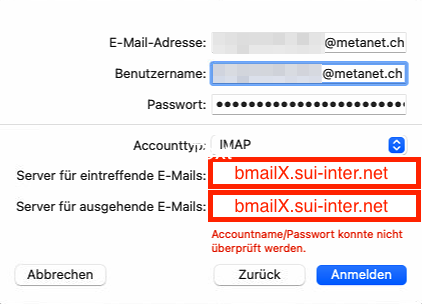 Sie tragen nun zwei Mal den Servernamen (bmail.sui-inter.net, bmail2.sui-inter.net, ….) aus der Einrichtungsbestätigung ein. Danach tragen Sie bei Benutzername die E-Mail Adresse ein.