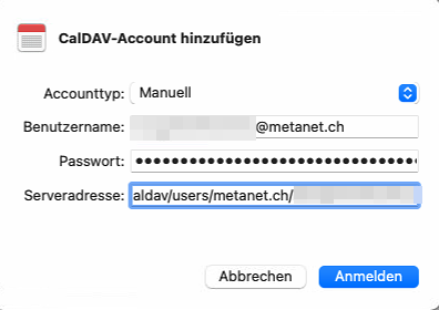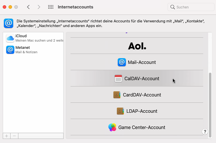 Wählen Sie nun CalDav für den Kalender (bzw. CardDav für Kontakte).