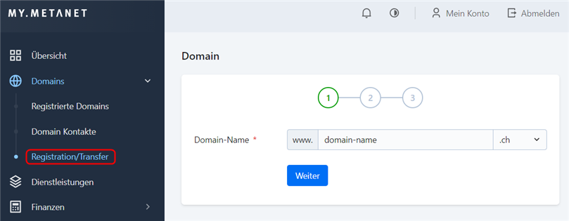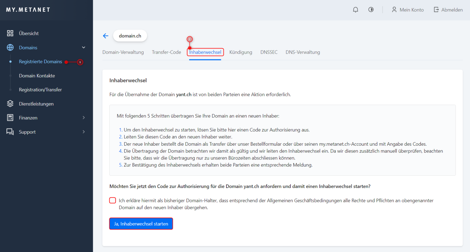 Für die Übertragung einer Domain ist das Einverständnis sowohl des aktuellen als auch des neuen Domain-Halters erforderlich. Der bisherige Domain-Halter erklärt, dass alle Rechte und Pflichten gemäss den Allgemeinen Geschäftsbedingungen auf den neuen Inhaber übergehen. Es gibt zwei Möglichkeiten, den Inhaberwechsel zu melden: elektronisch über das Kundenportal oder mittels eines Inhaberwechselformulars. Elektronisch erfolgt die Übertragung durch einen Autorisierungscode, der an den neuen Inhaber weitergeleitet wird. Alternativ kann das ausgefüllte Formular per Post, Fax oder eingescannt über das Support-Formular eingereicht werden. Beide Parteien erhalten eine Bestätigung des Wechsels.