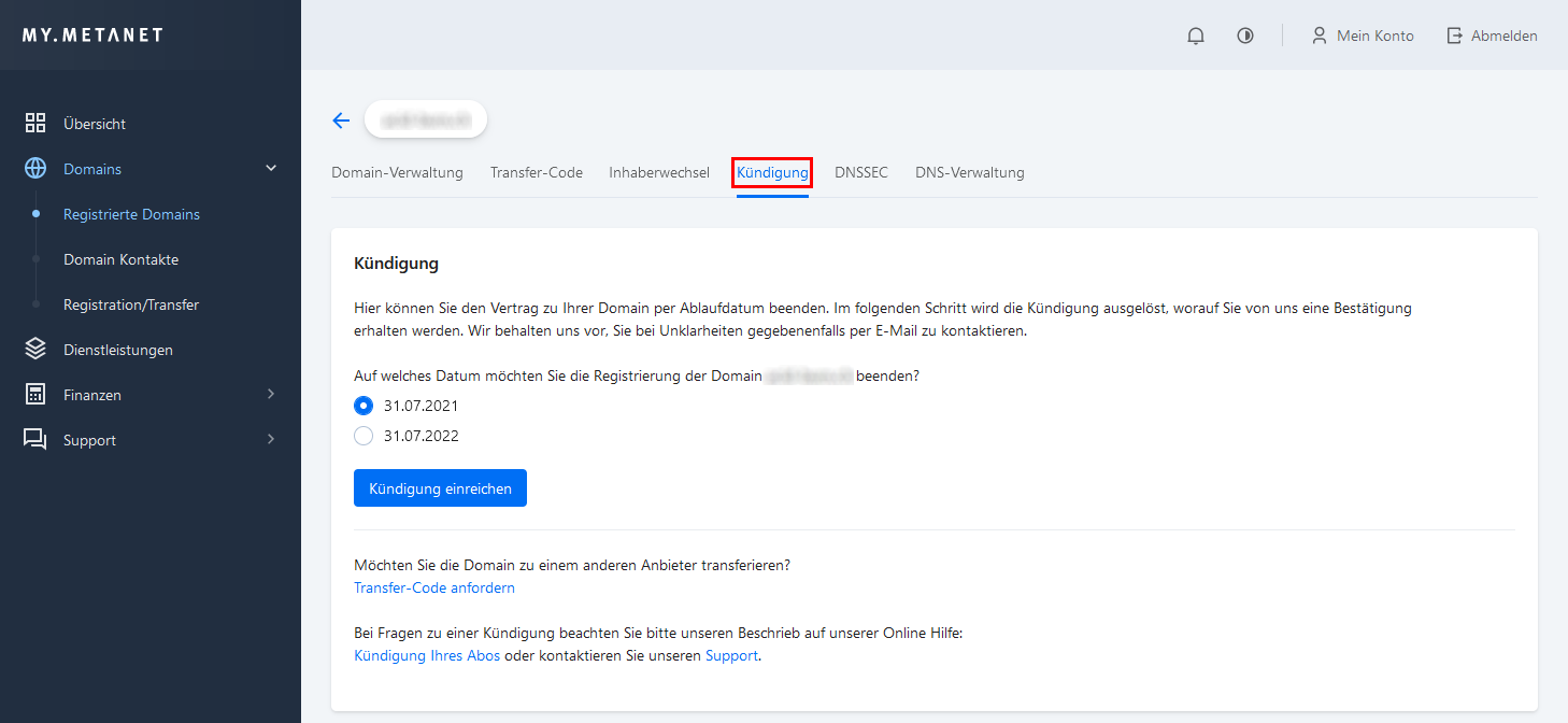 Um eine Domain bei Metanet zu kündigen, loggen Sie sich mit Ihrer Kundennummer und Passwort auf ein. Navigieren Sie zu "Domains", wählen Sie die zu kündigende Domain aus und klicken Sie auf "Kündigung". Eine Übersicht zeigt, wann die Domain gekündigt werden kann. Bestätigen Sie die Kündigung oder brechen Sie ab. Sie erhalten eine Bestätigung per E-Mail mit dem Auth-Code. Bei Unklarheiten wird Metanet Sie kontaktieren.