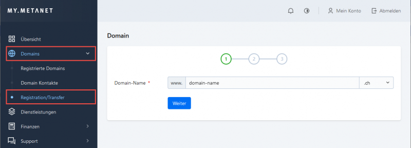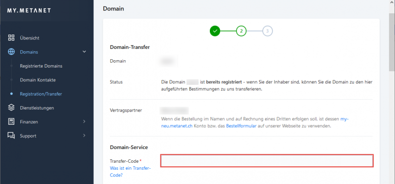 Falls Sie bereits eine Domain über uns registriert haben, können Sie den Transfer direkt über my.metanet.ch auslösen.