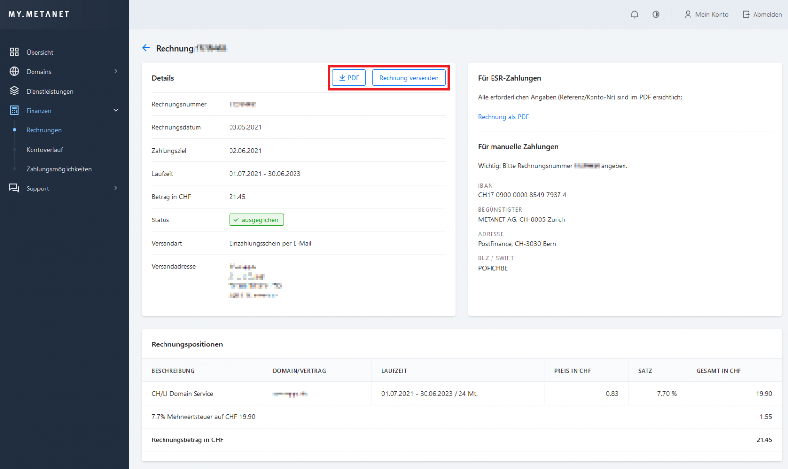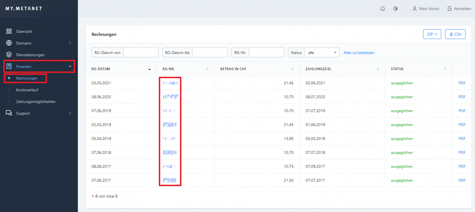 Sie finden sämtliche Rechnungen innerhalb des Kundenportals https://my.metanet.ch