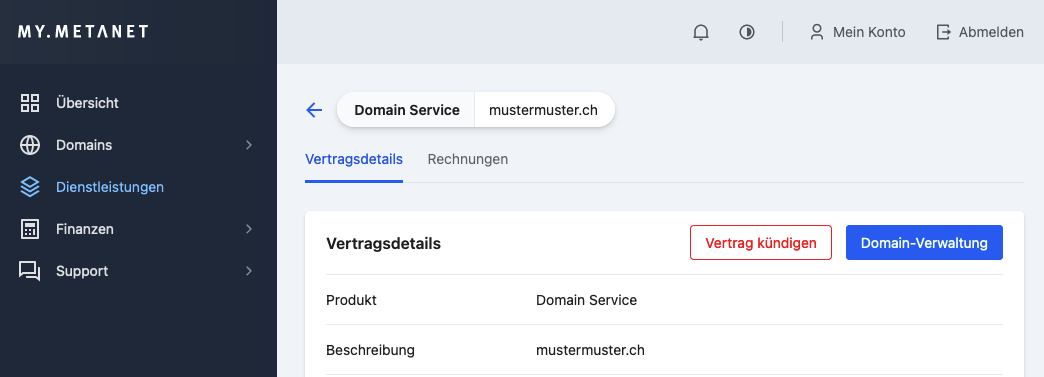 Um die Domain ohne Transfercode zu kündigen, klicken Sie in der Navigation links auf Dienstleistungen und anschließend direkt auf den betreffenden Domain Service. Klicken Sie nun in den Vertragsdetails auf den Menüpunkt Vertrag kündigen.