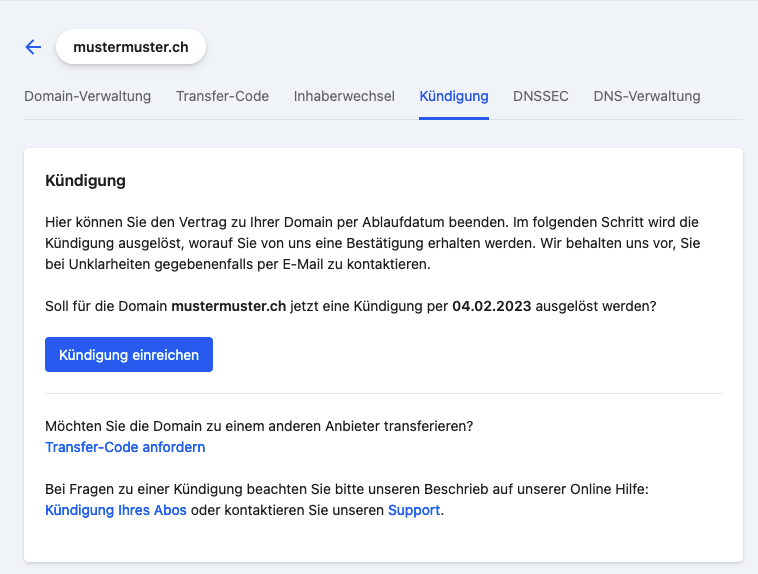 Die hier beschriebene Kündigung eignet sich nur, wenn die Domain nicht weiter gebraucht und nicht transferiert wird. Wenn Sie die Domain zu einem anderen Registrar wechseln möchten, gehen Sie bitte gemäß der Anleitung Domain Service: Transfercode / Auth Code anfordern vor.