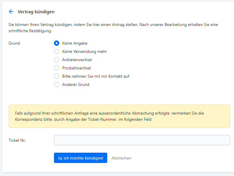 Falls mit Ihnen die Möglichkeit einer außerordentlichen Kündigung vereinbart worden ist, verwenden Sie bitte unser Kündigungs-Formular unter Angabe der Ticketnummer Ihrer Anfrage. Sie finden diese in der Betreffzeile der betreffenden E-Mail.
