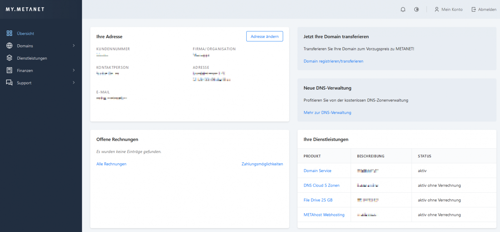 Das Kundenportal von Metanet ermöglicht administrative Anpassungen wie Adressänderungen, Rechnungsübersicht, Domainverwaltung, Dienstleistungsverwaltung und Support. Nutzer können Statusmeldungen abonnieren und Feedback zu Angeboten, Preisgestaltung, Kompetenz, Reaktionszeit und Verfügbarkeit geben.