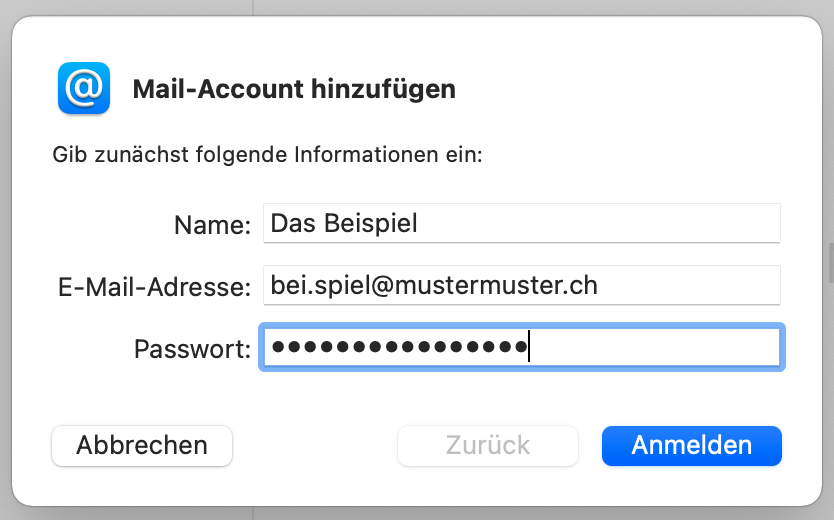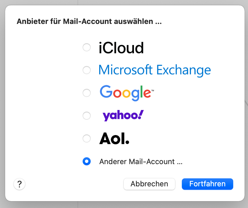 Wählen Sie Anderer Mail-Account… und bestätigen Sie mit Fortfahren: