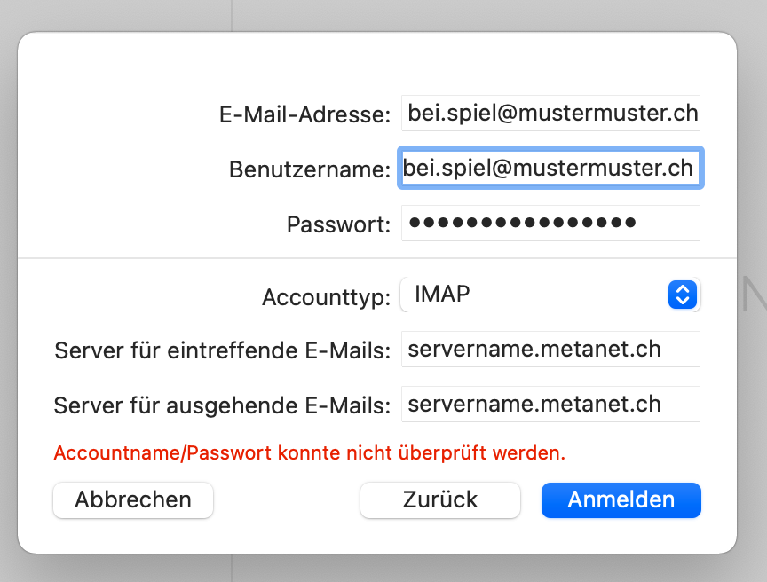 Geben Sie für beide Server den Namen aus der Abfrage von Benutzerangaben: Benutzername / Posteingangs- / Postausgangsserver ein. Danach tragen Sie die E-Mail Adresse noch bei Benutzername ein. Fahren Sie weiter mit Anmelden.