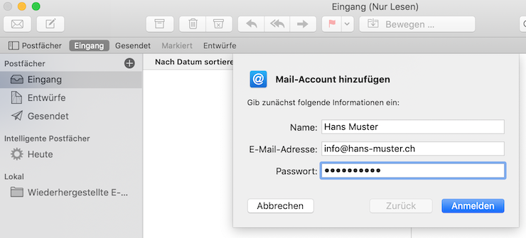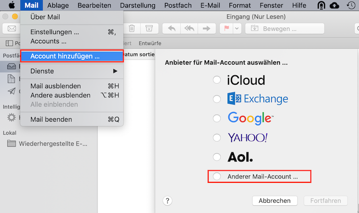 1. Öffnen Sie Mac Mail, klicken im Menü auf "Mail" und wählen Account hinzufügen aus. Anschliessend klicken Sie auf Option 'Anderer Mail-Account ...'