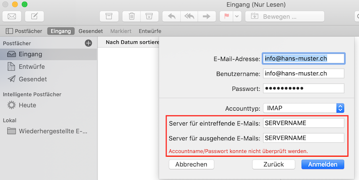 3. Ergänzen Sie den Servernamen für den Posteingang / Postausgang: