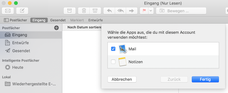 4. Es werden jetzt die Kontoeinstellungen gesucht. Dies kann etwas länger dauern. Warten Sie auf jeden Fall ab, bis folgendes Fenster erscheint und wählen Sie Mail aus: