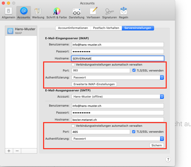 6. Navigieren Sie über Mail - Einstellungen - Account zum soeben erstellten Account. Entfernen Sie nun den Haken "Verbindungseinstellungen automatisch verwalten" und korrigieren Sie dort allenfalls den Port sowie (optional) die SSL-Verschlüsselung und setzen Sie die Authentifizierung auf Passwort.