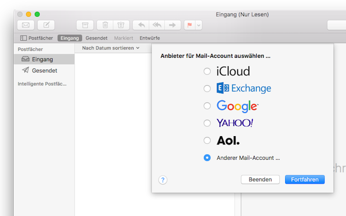 4. Es werden jetzt die Kontoeinstellungen gesucht. Dies kann etwas länger dauern. Warten Sie auf jeden Fall ab, bis folgendes Fenster erscheint und wählen Sie Mail aus: