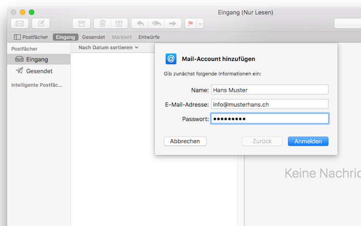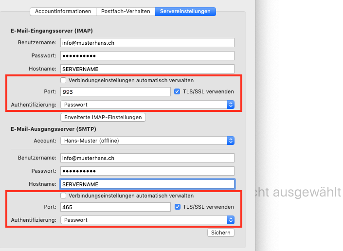 6. Navigieren Sie über Mail - Einstellungen - Account zum soeben erstellten Account. Entfernen Sie nun den Haken "Verbindungseinstellungen automatisch verwalten" und korrigieren Sie dort allenfalls den Port sowie die SSL-Verschlüsselung und setzen Sie die Authentifizierung auf Passwort.