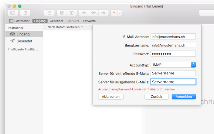 3. Ergänzen Sie den Servernamen für den Posteingang / Postausgang: