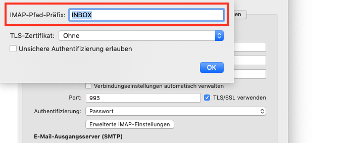7. Klicken Sie auf Erweitert. Setzen Sie den IMAP-Pfad-Präfix auf INBOX. (Standard bei IMAP)