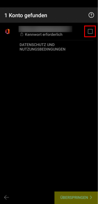 2. Falls die Meldung erscheint “1 Konto gefunden”: Entfernen Sie das gesetzte Häkchen und klicken Sie auf “ÜBERSPRINGEN”.