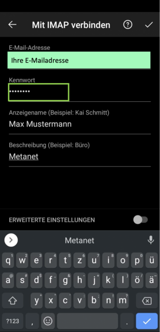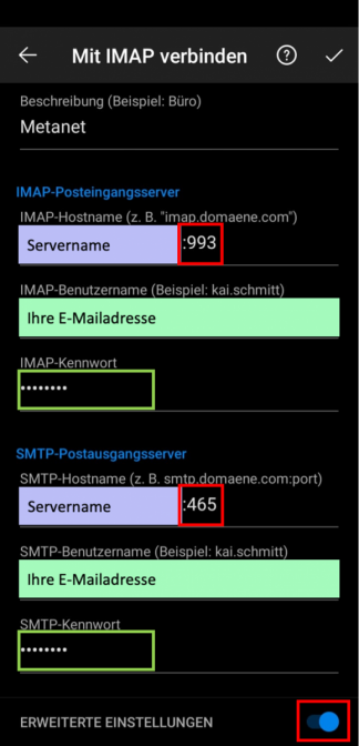 6. Wählen Sie “ERWEITERTE EINSTELLUNGEN”. Geben Sie anschliessend für IMAP- und SMTP-Server jeweils den Servernamen mit nach Doppelpunkt angehängter Portnummer, Ihre E-Mailadresse und das zugehörige Passwort an.