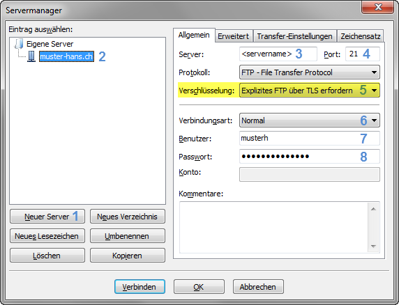Folgende Angaben müssen beim FTP Client für die Verbindung angegeben werden: