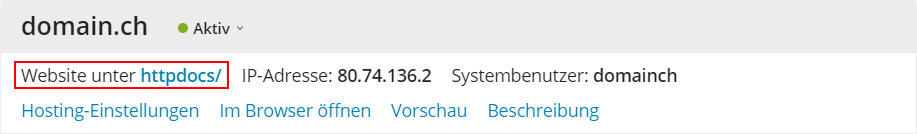 Den Dokumentenstamm für Ihre Webdaten sehen Sie in Plesk unterhalb des Domainnamen bei „Webseite unter“: