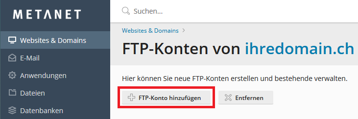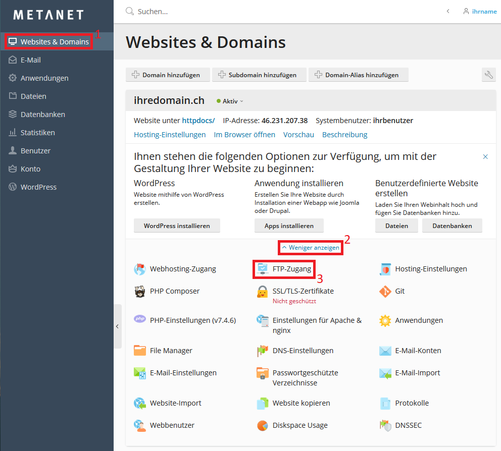 Um einen neuen FTP-Benutzer im Plesk Administrationstool hinzuzufügen, loggen Sie sich ein und navigieren Sie zur Registerkarte "Websites & Domains". Öffnen Sie die erweiterten Optionen und wählen Sie "FTP-Zugang". Fügen Sie einen neuen Benutzer hinzu und wählen Sie einen schwer zu erratenden Benutzernamen. Sie können den Zugriff auf ein bestimmtes Unterverzeichnis beschränken und ein sicheres Passwort generieren lassen oder selbst festlegen. Ein sicheres Passwort sollte Gross- und Kleinschreibung, Zahlen und Sonderzeichen enthalten. Weitere Informationen zu sicheren Passwörtern finden Sie auf der switch.ch Website und in den Sicherheitsrichtlinien von Metanet.