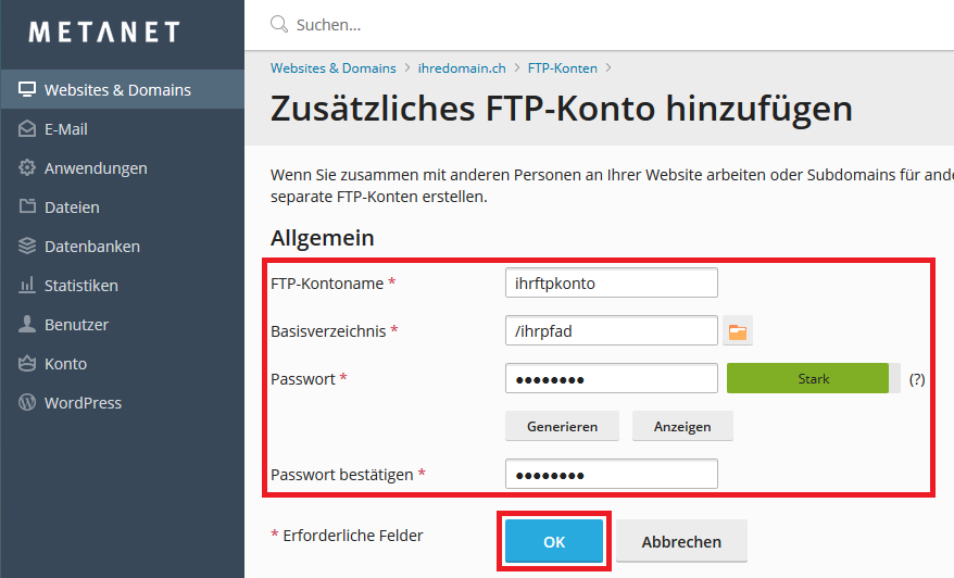 Wenn Sie möchten, dass der FTP-Benutzer nur auf ein bestimmtes Unterverzeichnis zugreifen darf, geben Sie den entsprechenden Pfad unter Basisverzeichnis an. Sie können sich dabei über den Generieren-Knopf ein sicheres Passwort erstellen lassen oder ein von Ihnen selber definiertes Kennwort eingeben. Ein sicheres Passwort beinhaltet Groß- und Kleinschreibung, Zahlen und Sonderzeichen. Weitere Informationen zum Thema sichere Passwörter finden Sie auf der switch.ch Website und unter unserer Übersicht zu Sicherheitsrichtlinien |