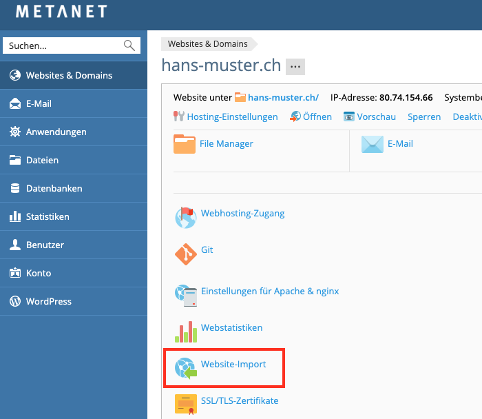 - Wählen Sie auf Plesk die gewünschte Domain und klicken Sie anschließend auf Website-Import.