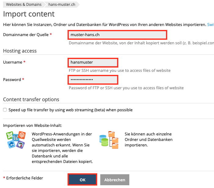 - Tragen Sie nun den Domainnamen der Quelle ein. Unter "Hosting Access" wird der FTP-Benutzername sowie das Passwort vom Quellserver eingetragen. Sollten Sie dies nicht zur Hand oder gar vergessen haben, wenden Sie sich bitte an Ihren aktuellen Hoster.