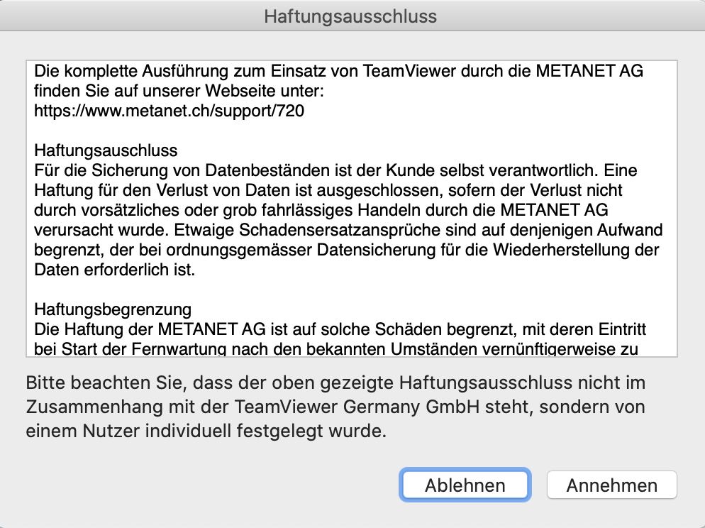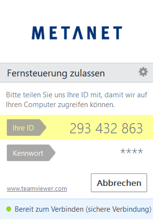 | Mit der Bekanntgabe Ihrer ID erklären Sie sich mit unserem Haftungsausschluss zum Einsatz von TeamViewer einverstanden. |
