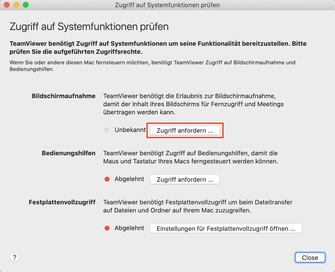 4. Anschließend werden die Berechtigung auf Zugriff der Systemfunktionen geprüft. Bitte klicken Sie bei Bildschirmaufnahme auf Zugriff anfordern.