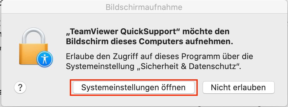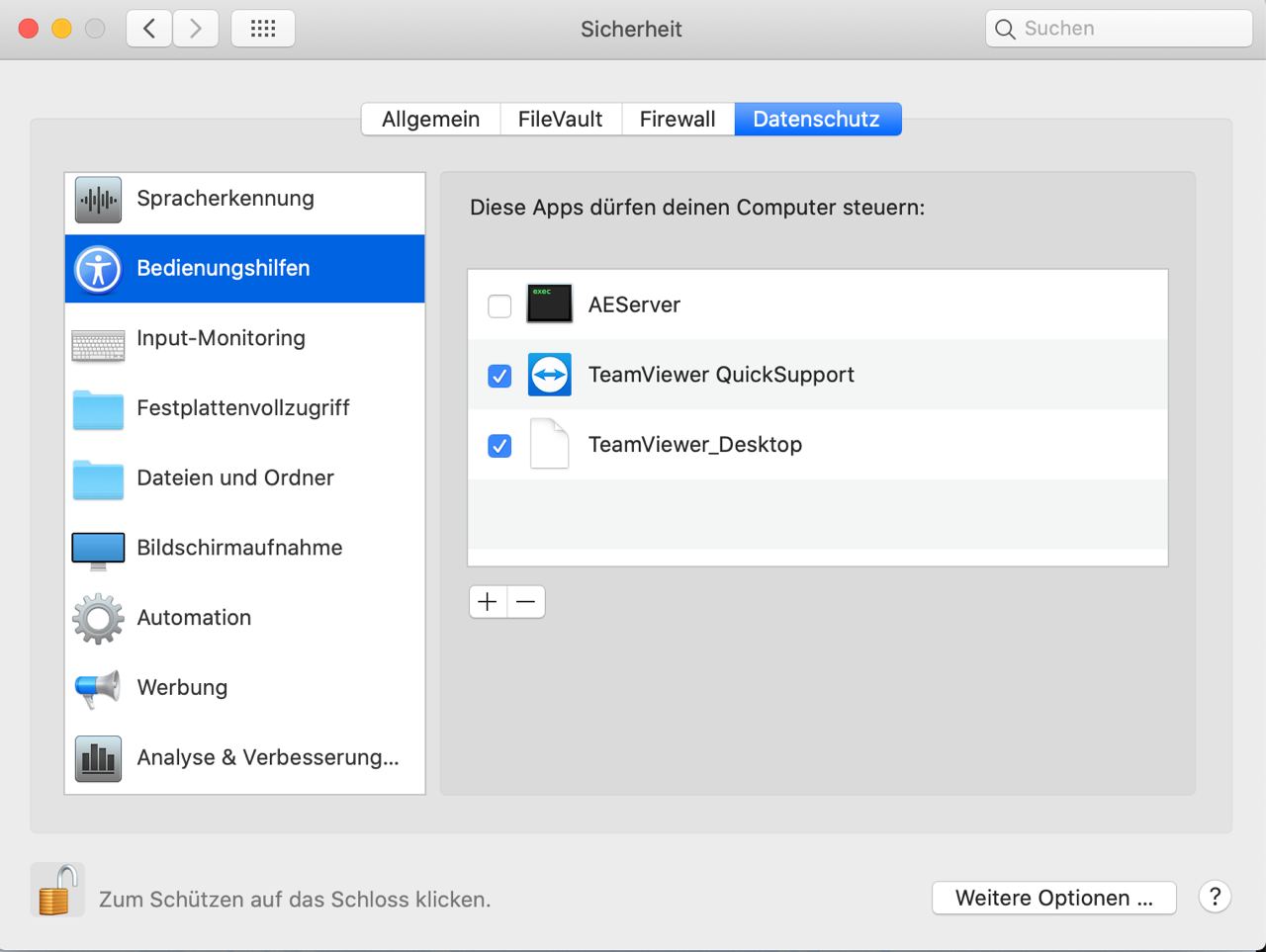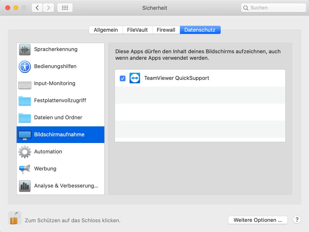 5. In den Sicherheitseinstellungen Ihres Mac setzen Sie nun bitte die Haken für TeamViewer bei Bildschirmaufnahme sowie bei Bedienungshilfen.